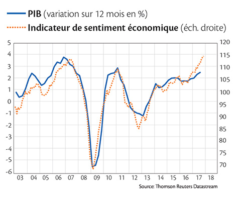 Pour les marchés, l’année 2018 pourrait être un peu moins parfaite que ne l’était 2017. Sur le plan économique, en revanche, les signaux restent positifs. Bon nombre des risques encore présents il y a un an ont disparu. La croissance mondiale devrait continuer de progresser aux environs de 3,5% et les politiques monétaires se diriger très graduellement vers la normalisation. Les principales économies de la planète devraient poursuivre leur marche en avant synchronisée pendant la première partie de l’année au moins, tout en vivant des moments différents de leur cycle. La zone euro traverse une période de rattrapage après avoir essuyé deux récessions en moins de dix ans. Elle devrait à nouveau enregistrer un taux de croissance supérieur à 2%. L’amélioration du marché de l’emploi devrait permettre de solidifier la demande intérieure. Un élément essentiel, alors que l’économie européenne est moins avancée dans le cycle économique que ses partenaires commerciaux.