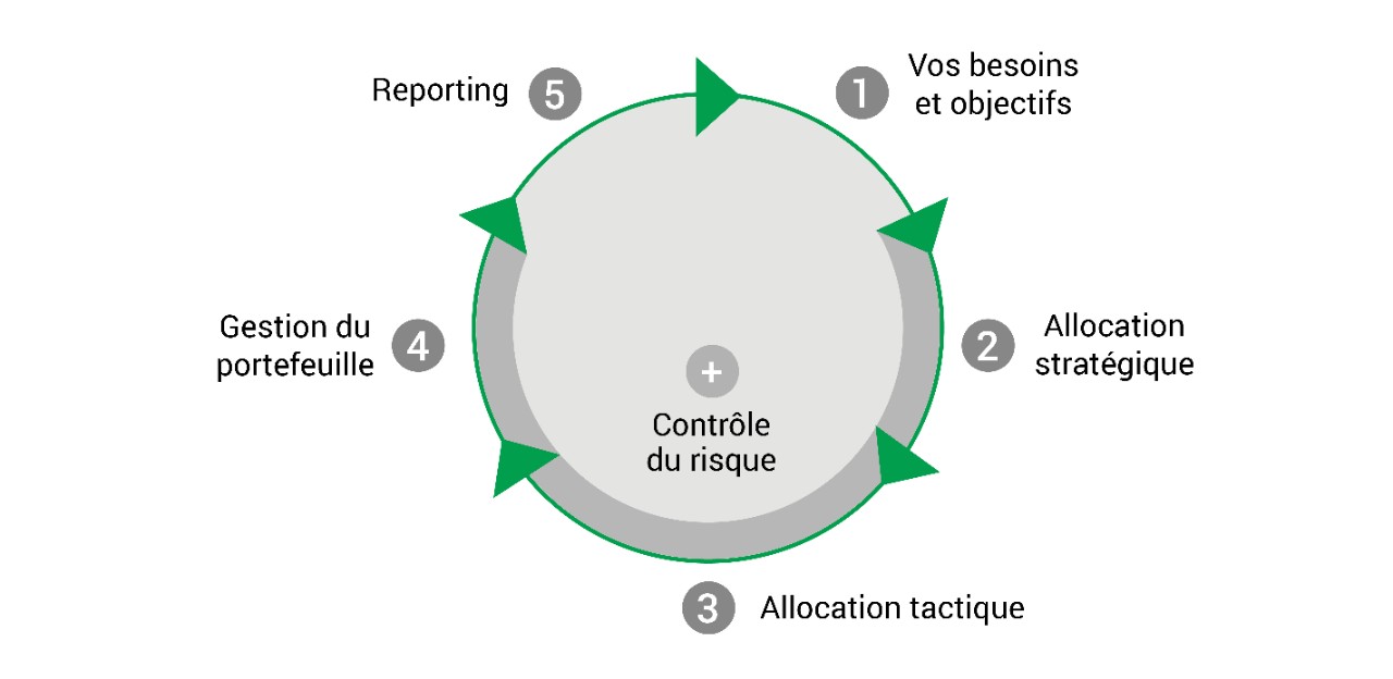Pour assurer une gestion méticuleuse de vos avoirs, nous appliquons un processus éprouvé permettant de satisfaire vos besoins de rendements sur la durée, avec une maîtrise optimale du risque.