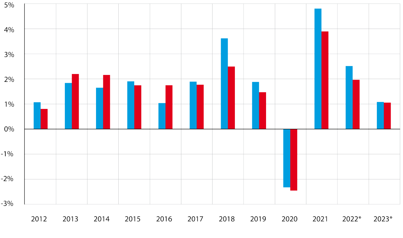 Après la crise du Covid-19 et une forte reprise en 2021 (+4,8%), la croissance romande devrait se replier sensiblement cette année et l’an prochain. Les dernières prévisions du CREA portent sur une croissance de 2,5% en 2022 et 1,1% en 2023. La comparaison avec la Suisse reste tendanciellement favorable pour la Suisse romande, avec des hausses du PIB de 2,0% cette année et de 1,1% l’an prochain attendues sur le plan national.