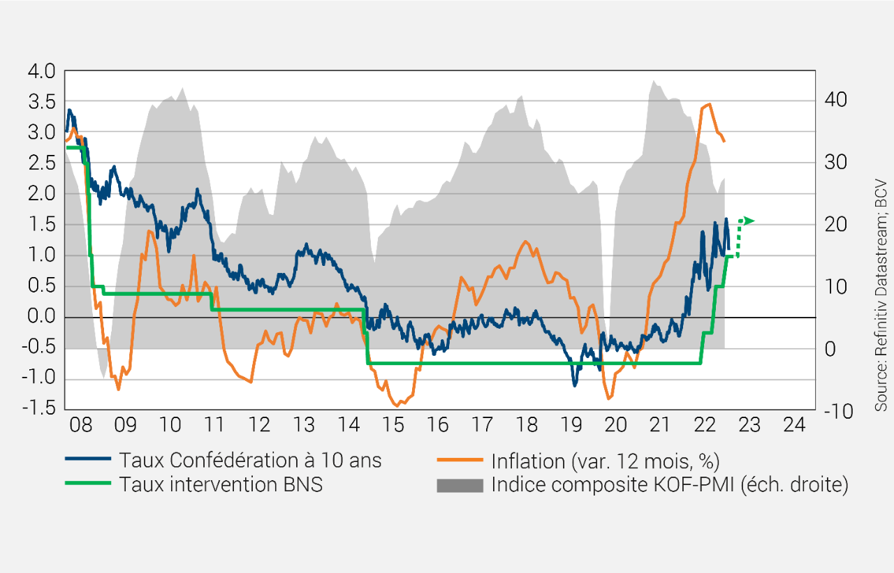 Si l’inflation décroît, elle demeure à des niveaux encore éloignés de l’objectif de 2% fixé par les banques centrales. Les autorités monétaires devraient ainsi poursuivre leur hausse de taux jusqu’au printemps, mais à un rythme bien plus contenu que celui imposé l’an dernier. Les taux directeurs pourraient tendre vers 5% aux États-Unis, vers 3% en zone euro et vers 1,5% en Suisse. Les banques centrales restent suspendues aux chiffres de l’emploi. Le taux de chômage demeure en effet trop bas pour assurer une décrue durable des prix.