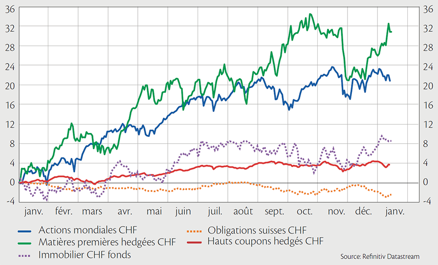 Sur le plan thématique et sectoriel, l’idéal serait de marier le meilleur des différents mondes au gré de l’évolution des indicateurs: cycliques et défensifs par exemple, mais aussi titres de valeur et de croissance. Ainsi, certains secteurs sensibles à la conjoncture peuvent bénéficier de la hausse des prix, comme l’énergie, les matériaux de base ou l’industrie liée à la transition énergétique. C’est d’autant plus vrai, si les entreprises possèdent la capacité à transmettre la hausse des prix à leurs clients finaux. Alors qu’approche une zone de turbulence, les traditionnelles valeurs défensives peuvent apporter leur soutien. Il en va ainsi des pharmas ou des producteurs de biens de consommation non durables. L’heure est peut-être aussi venue d’aller chercher des solutions adaptées à la complexité environnante dans les produits structurés ou de gestion asymétrique.